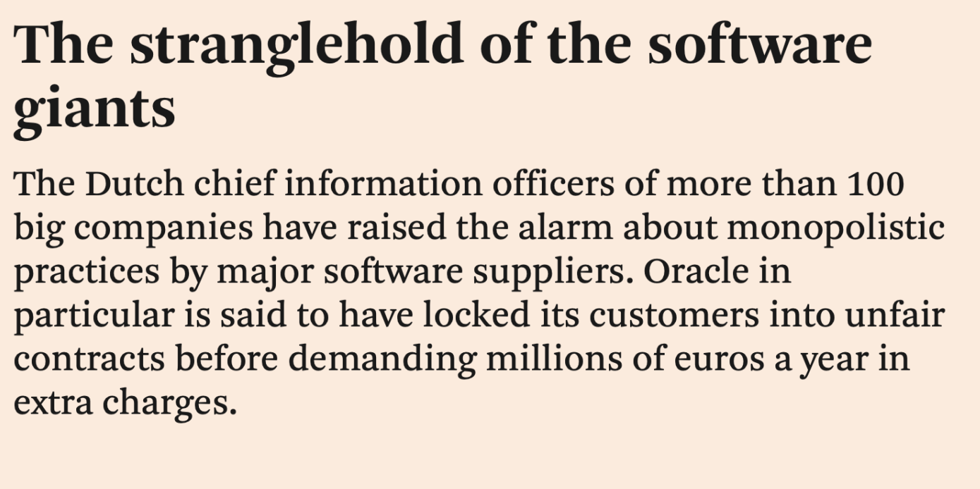Today, the FD (the renowned Financial Daily – who also participated in the Panama Papers) published a long article (english version here) for which I was also interviewed. Apparently the Dutch CIO Platform, representing over 100 of the largest dutch companies including Shell, KLM, Philips, NXP ASML and 4 ministries are discussing ’s widely criticised sales- and audit practices with the European Commission reporting bullying, anti-competitive and market disturbing behaviour from Oracle. Client specific conflicts are exposed, including legal disputes that have occurred in several countries. It is expressed that One CIO who is cited about how doing business with Oracle is experienced: